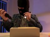 When business woman Kathy Anderson hears a disturbance outside her office window, she realizes Michael Fly is trying to break in! Kathy hides behind the door as Michael enters the room. Michael creeps through the office looking for valuables, but unfortunately for him, only finds office supplies! As he rummages through Kathy's desk, the blonde MILF crawls under the desk and disarms him by giving him a handjob. Kathy pulls out Michael's cock, then gives him a blowjob while playing with her tits. Kathy fucks Michael under her desk, on top of her desk, and then lets him cum on her face as sirens blare in the background!